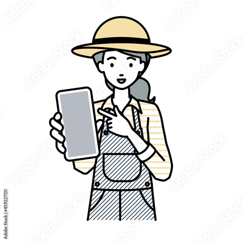 立ってスマートフォンを指差してこちらに向けて見せている農家の女性
