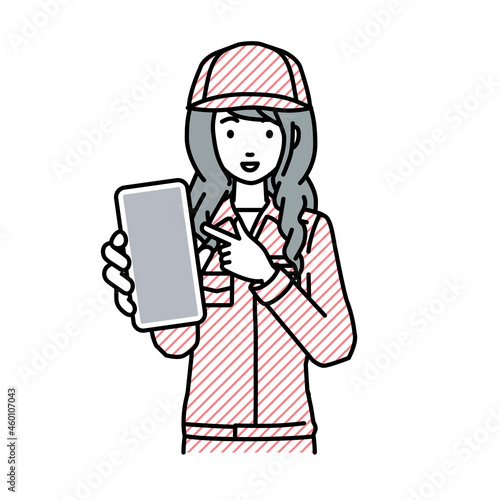 立ってスマートフォンを指差してこちらに向けて見せている作業員の女性