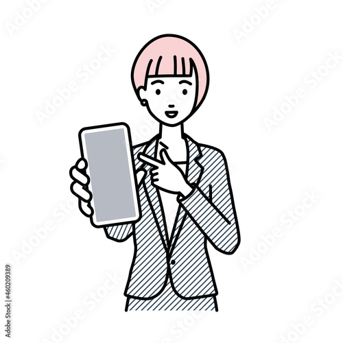 立ってスマートフォンを指差してこちらに向けて見せているスーツの女性