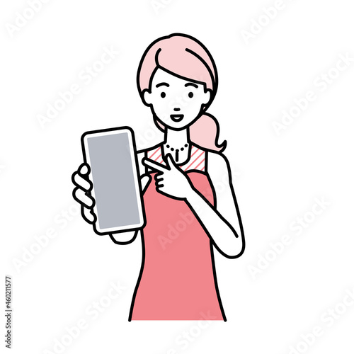 立ってスマートフォンを指差してこちらに向けて見せているドレスの女性