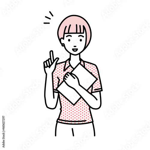 立って書類を手に持って何かひらめいたポロシャツの女性
