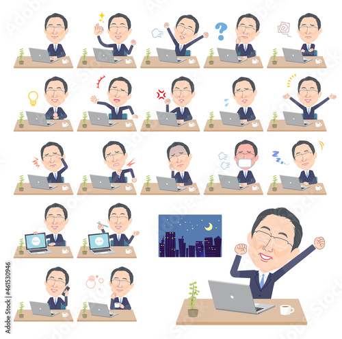 デスクワークに関する眼鏡をかけた壮年男性のセット