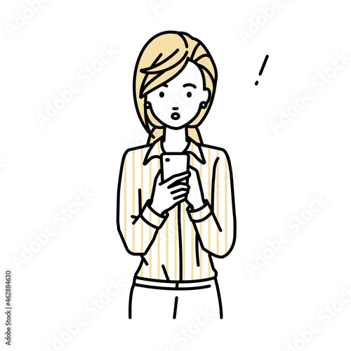 立ってスマートフォンを操作して何かに気づいて驚いたブラウスの女性