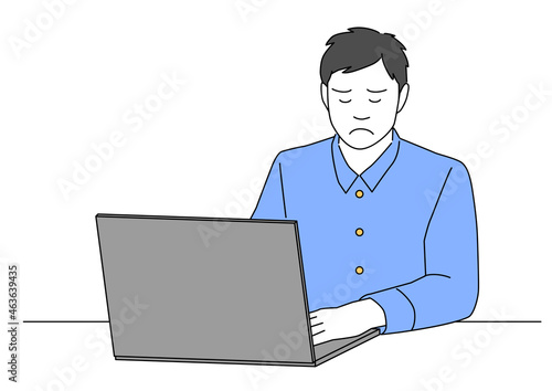 パソコンで作業中悩む男性-青色