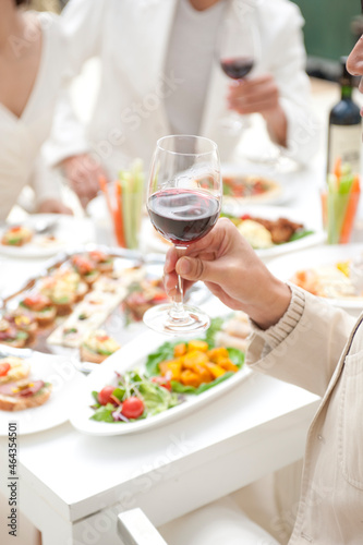 ホームパーティーで赤ワインとオードブルを食べる人達