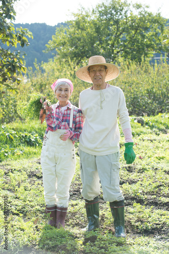 畑で人参を収穫するシニア夫婦