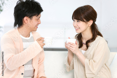 ソファーに座ってお茶を飲むカップル