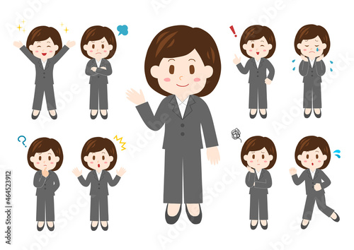 女性ビジネスパーソンのポーズと表情のイラスト: 全身セット