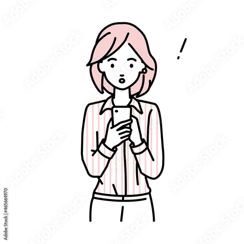 立ってスマートフォンを操作して何かに気づいて驚いたブラウスの女性
