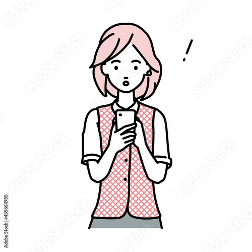 立ってスマートフォンを操作して何かに気づいて驚いた事務員制服の女性