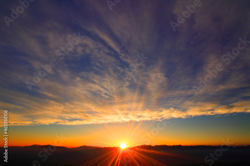 穂高連峰など北アルプスの山並みと夕日, 上田市,長野県