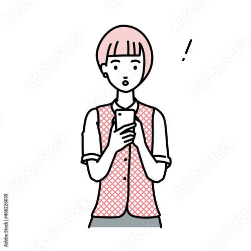 立ってスマートフォンを操作して何かに気づいて驚いた事務員制服の女性