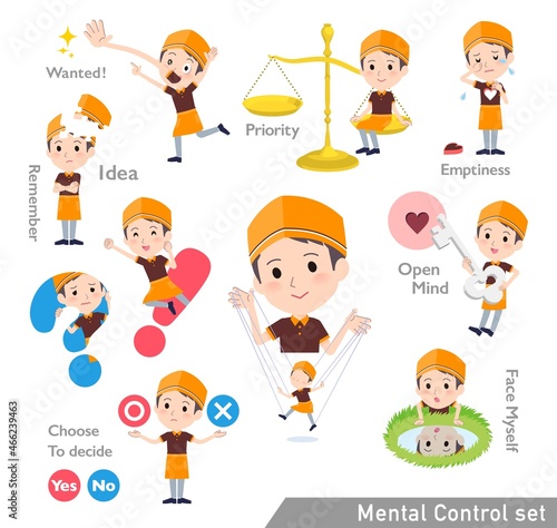 メンタルコントロールをするファストフード店員男性のセット