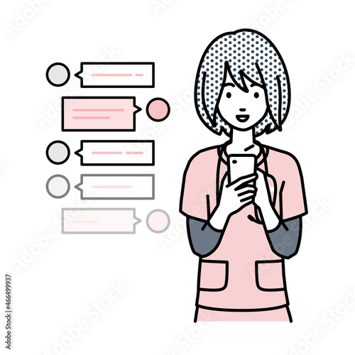 立ってスマートフォンで楽しくチャットで会話する看護師の女性