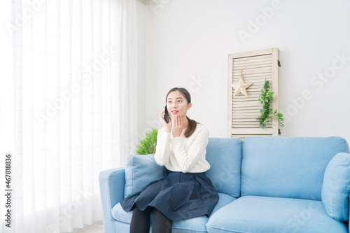 女性 電話する リビング
