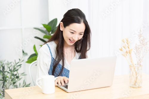 リビングでノートパソコンを使う主婦