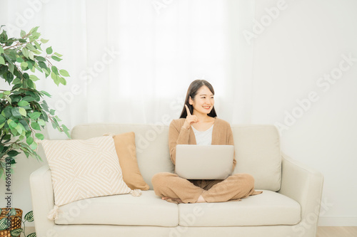 家でノートパソコンを使う女性(ソファ)