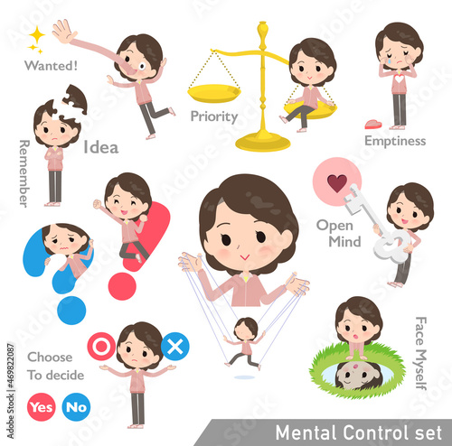 メンタルコントロールをするピンクジャージ中年女性のセット