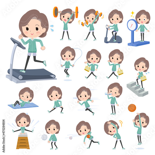 エクササイズやスポーツに関する青緑ジャージ中年女性のセット