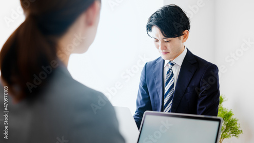 仕事をしながらコミュニケーションを取るビジネスマンとビジネスウーマン