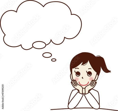 ほおに手を当て、考え事をする笑顔の若い女性。