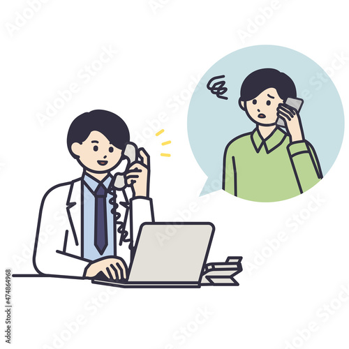 困っている男性の相談に乗る白衣を着た男性のイラスト素材