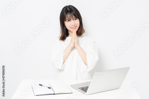 ノートパソコンを使いながら、願い事をする若い女性