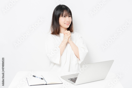 ノートパソコンを使いながら、願い事をする若い女性