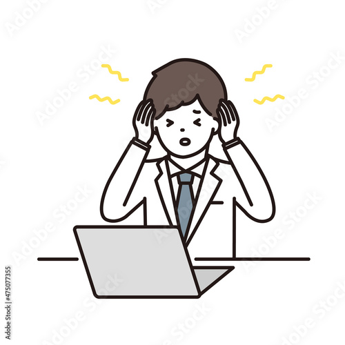 パソコンの前で耳鳴りに悩む男性薬剤師・医師のイラスト