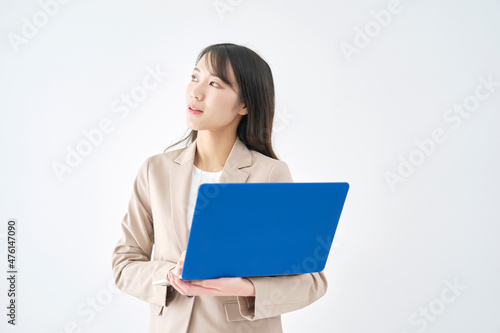 女性 ビジネス パソコン 白背景