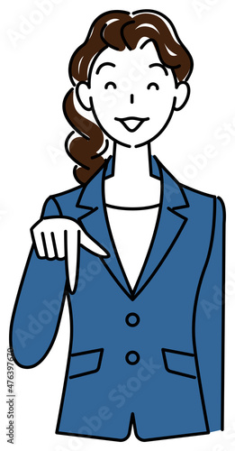 笑顔で下の方向を指で指しているスーツ姿の可愛いい女性 ビジネスパーソン イラスト ベクター
