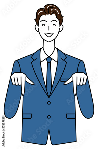 笑顔で下の方向を指で指しているスーツ姿の可愛いい男性 ビジネスパーソン イラスト ベクター