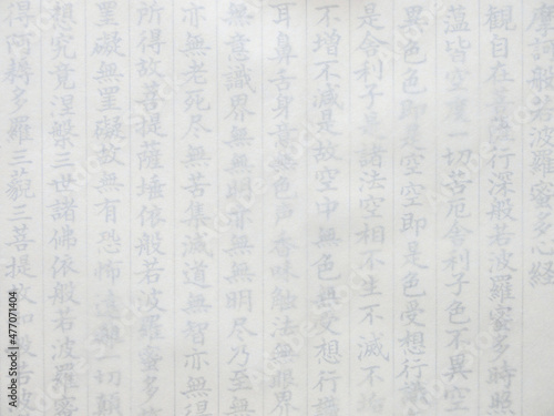 横長の上に半紙を置いてぼかした『般若心経』の写経見本の一部。仏教、宗教、東洋のイメージ背景素材。真上からの撮影。