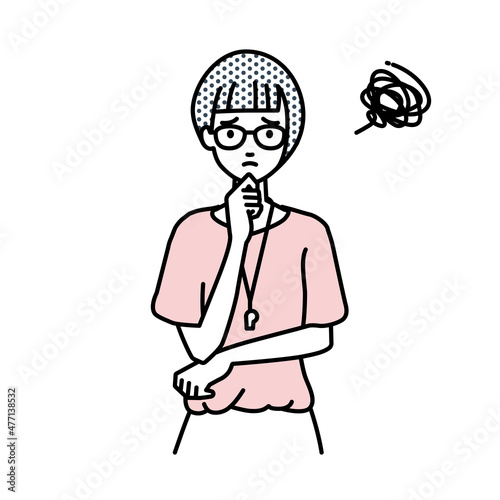 立って手をあごにあてて困っている教師の女性