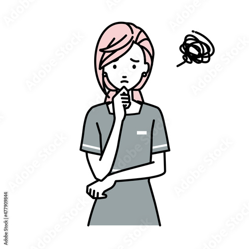 立って手をあごにあてて困っているエステ店員の女性