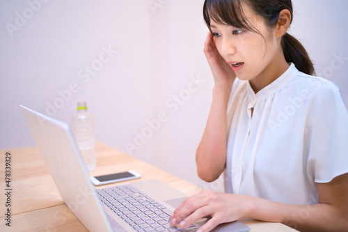 パソコンの画面を見て考える女性