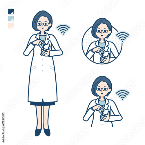 白衣を着た女性医師がスマートフォンを操作しているイラスト
