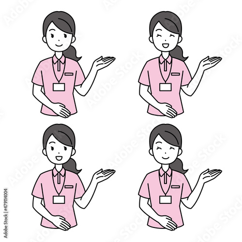 笑顔で案内するポロシャツの女性(左手)