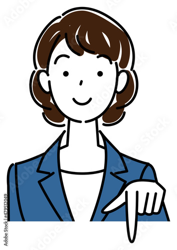 笑顔で下の方向を指差しているスーツ姿の可愛い女性 ビジネスパーソン イラスト ベクター