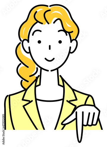 笑顔で下の方向を指差しているスーツ姿の可愛い女性 ビジネスパーソン イラスト ベクター