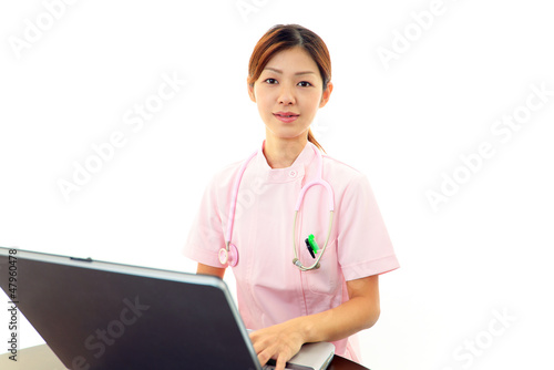 パソコンで仕事中の笑顔の女医