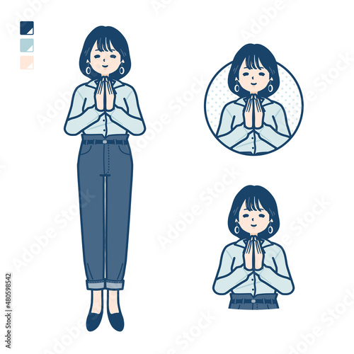 オープンカラーシャツを着た若い女性が合掌しているイラスト