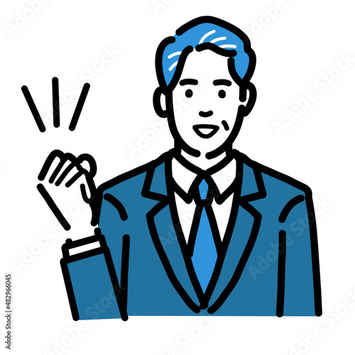 笑顔でガッツポーズをしているスーツを着た中年男性