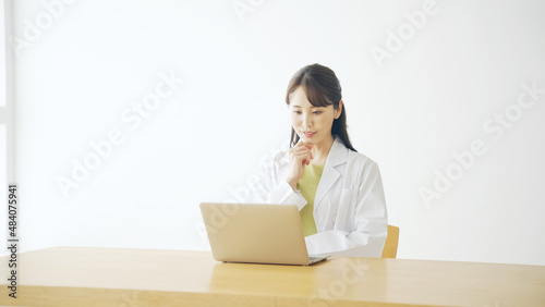 パソコンを見る白衣の女性