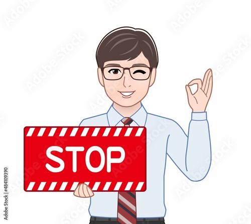 ストップのパネルを持っている男性