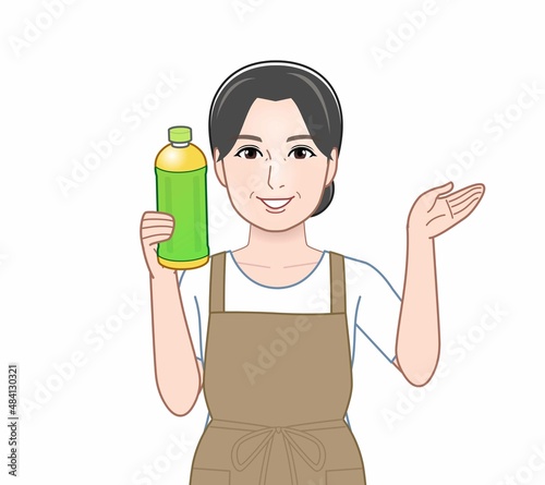 ペットボトルのお茶をもつ女性