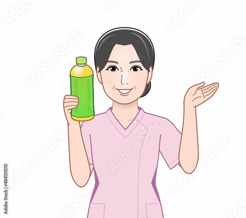 ペットボトルのお茶をもつ女性