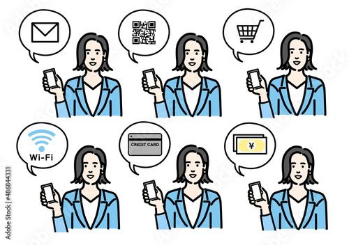 スマートフォンを持って説明をしているスーツを着た若い女性のセット