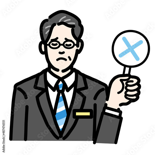 バツの札を持って残念そうなバッヂのついたスーツを着たメガネをかけた中年男性