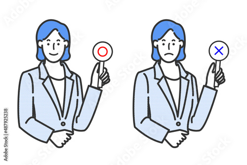 スーツ姿のビジネスウーマンのマルバツやオッケーなどの表情バリエーションの白背景に線画のシンプルなイラスト
